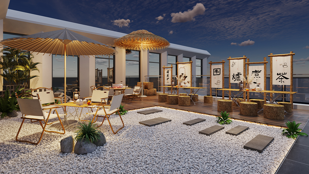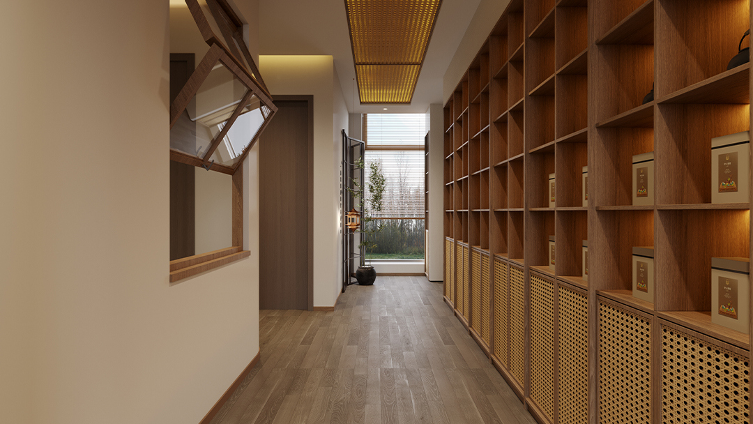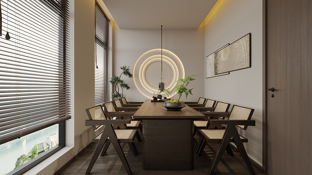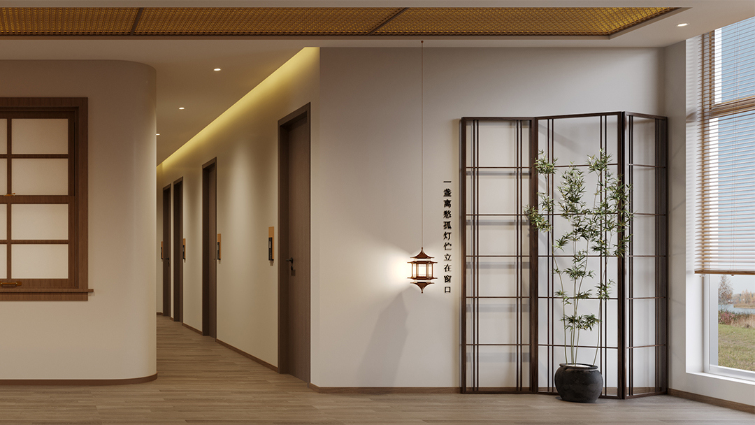 采用原木、竹編、素水泥等天然材質(zhì),搭配啞光金屬收邊條提升細(xì)節(jié)質(zhì)感;通過透光云石、鏤空屏風(fēng)與智能調(diào)光系統(tǒng),營造“虛實相生”的靜謐氛圍。 - 空間功能的禪意表達(dá)