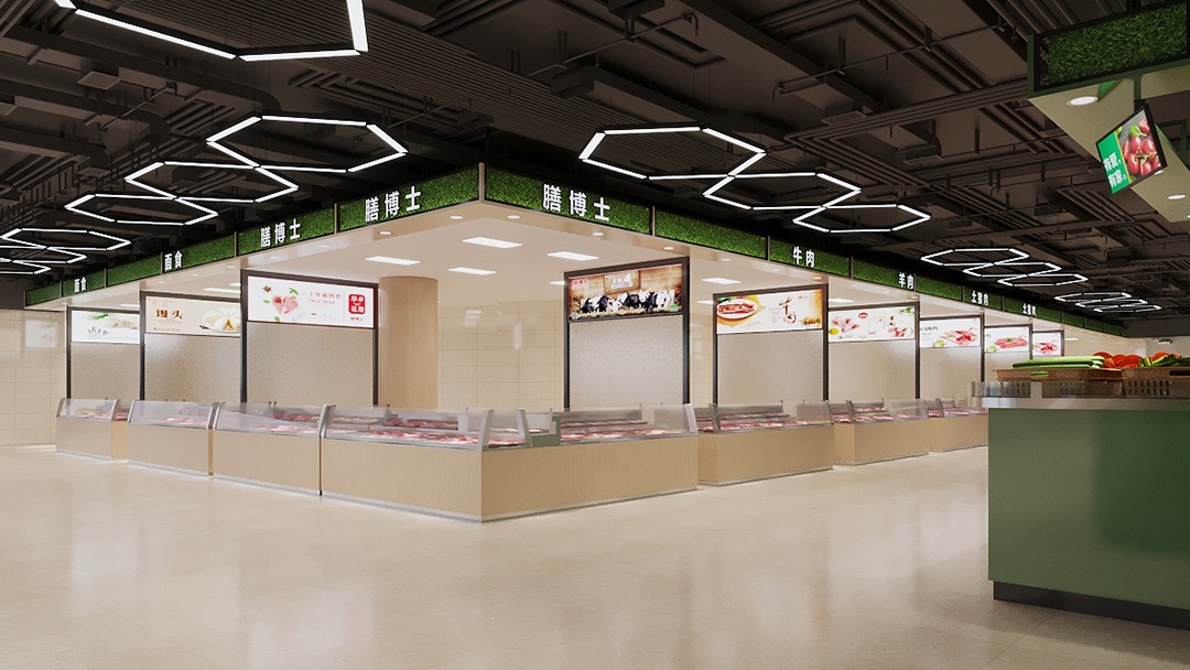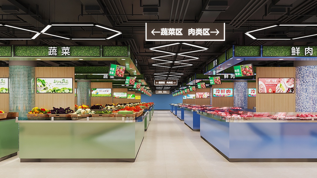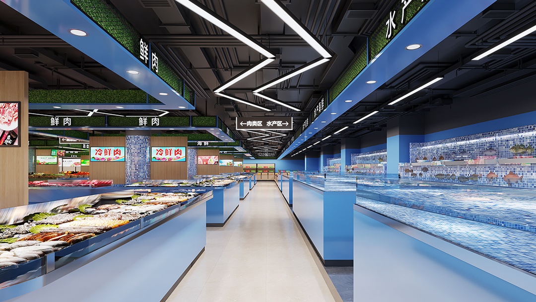 杭州生鮮超市裝修設(shè)計(jì),巧妙運(yùn)用色彩分區(qū),以藍(lán)色勾勒生鮮區(qū),綠色暈染蔬果區(qū),打造出別具一格的購(gòu)物空間。踏入生鮮區(qū),靜謐而深邃的藍(lán)色調(diào)撲面而來(lái),營(yíng)造出海洋般的清涼氛圍。冷柜、展示架皆以藍(lán)色為主,與各類鮮活的海鮮、肉類相互映襯,凸顯品質(zhì)與新鮮。移步蔬果區(qū),清新的綠色瞬間讓人心曠神怡。生機(jī)勃勃的綠植裝飾與翠綠的蔬果相得益彰,仿佛置身于田園之中。合理的陳列布局,讓每一顆果實(shí)、每一把蔬菜都能盡情展現(xiàn)其飽滿姿態(tài)。藍(lán)綠交織的設(shè)計(jì),不僅為顧客帶來(lái)視覺(jué)上的享受,更引導(dǎo)著購(gòu)物動(dòng)線。在這里,每一次挑選都是與自然的親密對(duì)話,開啟一場(chǎng)鮮活、健康的購(gòu)物之旅。