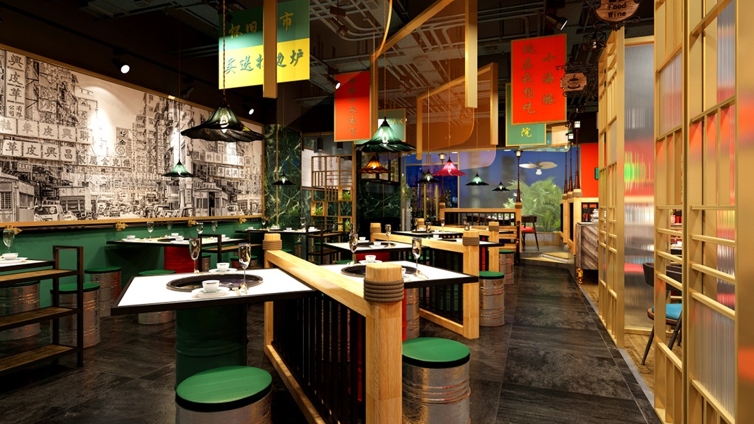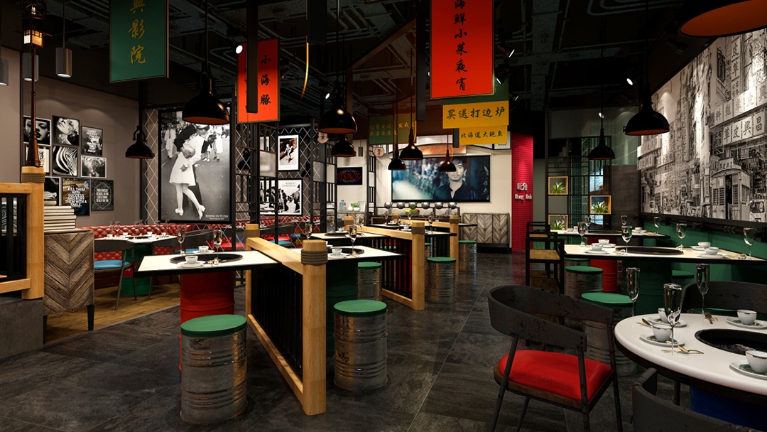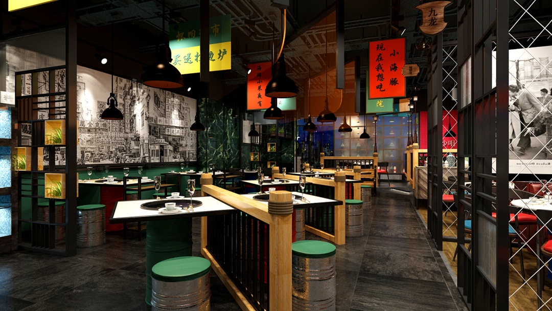 杭州懷舊風(fēng)火鍋店裝修設(shè)計(jì)中,為了營(yíng)造出簡(jiǎn)約、隨意、懷舊,且具有煙火氣息的用餐環(huán)境。同時(shí),明確傳達(dá)出“價(jià)格平民”的訊息,吸引喜愛(ài)這種風(fēng)格的顧客,前來(lái)體驗(yàn)。我們?cè)趬γ嫔?,張貼具有年代感的大字報(bào)和老照, 展示過(guò)去市井生活的場(chǎng)景,如老街巷、老火鍋店等,喚起顧客的懷舊情感。并利用廢舊的大鐵桶,改造成獨(dú)特的椅子,既體現(xiàn)了環(huán)保理念,又增加了空間的工業(yè)風(fēng)格元素。頂面,巧妙懸掛手寫主打菜名,和優(yōu)惠活動(dòng)牌子。既吸引顧客注意,又能增添一絲文化氣息。