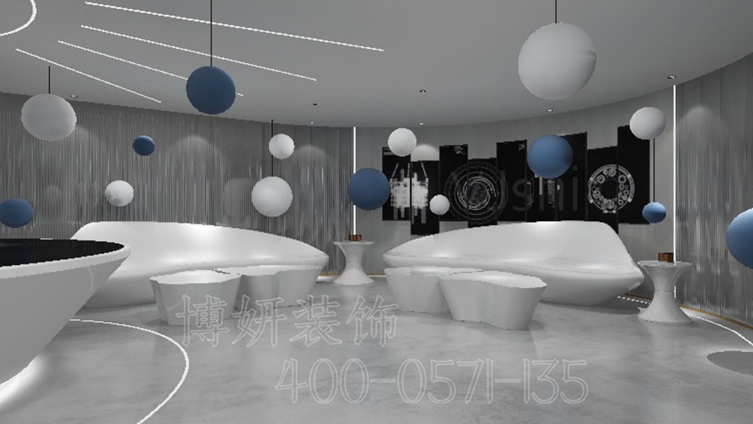 藍(lán)色,作為點(diǎn)綴色巧妙融入,或是在展示屏幕的邊框,或是在休息區(qū)的軟裝,為冷靜的空間增添靈動(dòng)與科技感。線性燈帶,沿著墻面、天花板蜿蜒伸展,如流動(dòng)的光河,不僅勾勒出空間的輪廓,更營(yíng)造出未來感十足的氛圍。