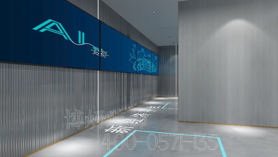 多媒體設(shè)備與空間設(shè)計(jì)完美融合,通過互動(dòng)展示、沉浸式體驗(yàn)等形式,讓參觀者深度感受數(shù)字科技的魅力。杭州數(shù)字多媒體展廳,以灰白藍(lán)的色彩搭配與線性燈帶的巧妙運(yùn)用,打造出一個(gè)大氣、前沿且極具吸引力的科技展示空間。