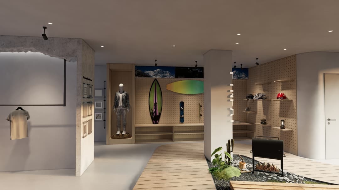 - 功能分區(qū)優(yōu)化:設(shè)置動(dòng)態(tài)展示區(qū)與靜態(tài)試衣間,通過(guò)高低錯(cuò)落平臺(tái)劃分區(qū)域,既保證顧客探索動(dòng)線的流暢性,又滿足裝備試用的專業(yè)需求;