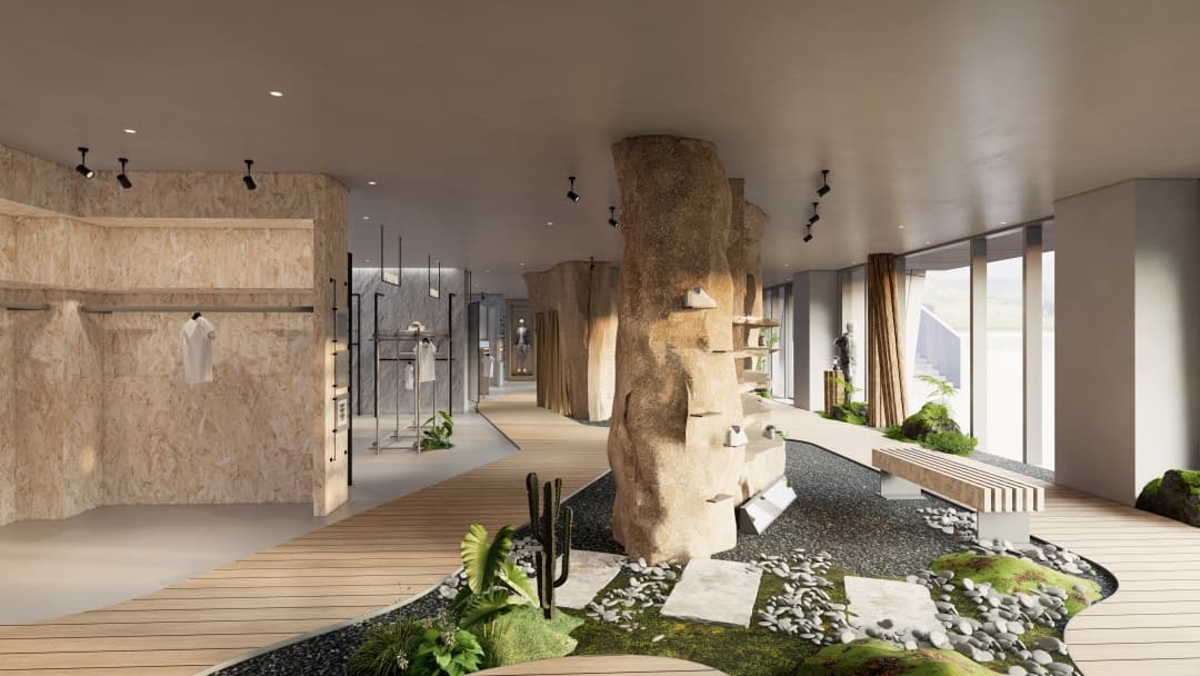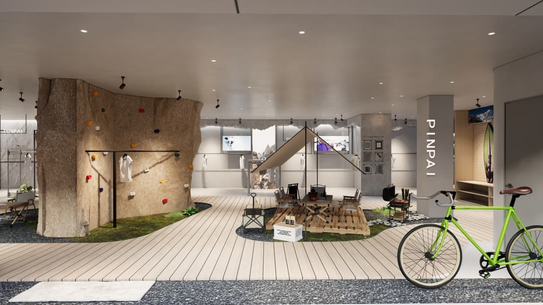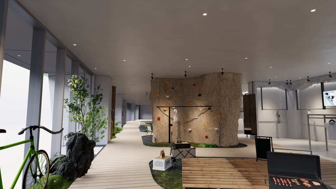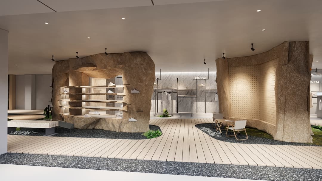 - 沉浸式場(chǎng)景營(yíng)造:運(yùn)用巖石紋理、綠植墻及仿木質(zhì)元素還原自然氛圍,搭配可調(diào)節(jié)色溫的射燈模擬不同時(shí)段光線,強(qiáng)化產(chǎn)品在登山、徒步等場(chǎng)景中的適配性;