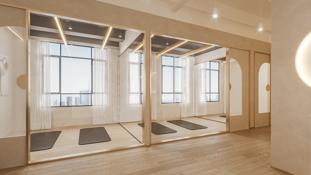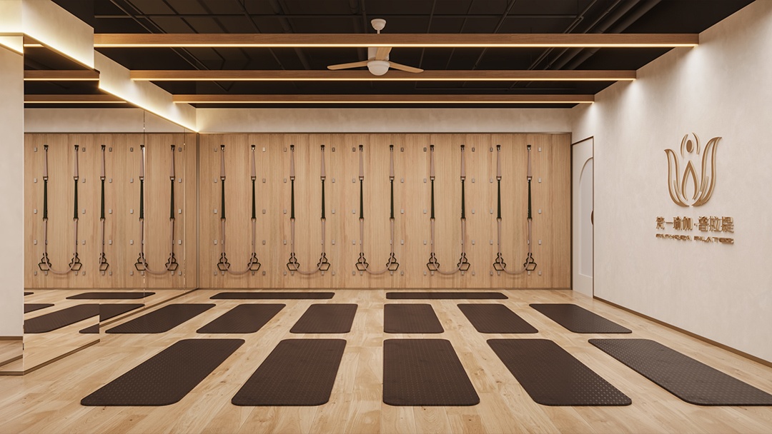 杭州簡約風(fēng)普拉提館裝修設(shè)計,本案以“呼吸感空間”為核心理念,采用米白與淺灰為主調(diào),融入溫潤原木元素。墻面采用自帶肌理的環(huán)保涂料,搭配隱藏式線性光源,光線柔和漫射。器械選用統(tǒng)一低飽和色系,可移動的普拉提床與折疊椅實現(xiàn)空間彈性。重點打造“懸浮鏡面”裝置——大幅鏡子底部留空,視覺上減輕壓迫感;綠植點綴于角落,自然氣息在簡約中流動,營造出專注且松弛的練習(xí)氛圍。